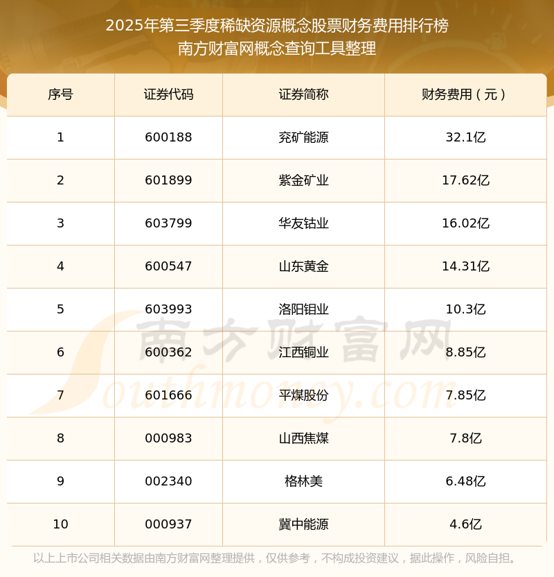 2025年第三季度,稀缺资源概念股票财务费用排行榜中,兖矿能源(600188)财务费用总额高达32.1亿,紫金矿业(601899)和华友钴业(603799)位居第二和第三,山东黄金(600547)、洛阳钼业(603993)、江西铜业(600362)、平煤股份(601666)、山西焦煤(000983)、格林美(002340)、冀中能源(000937)进入前十,财务费用总额分别排名第4-10名。