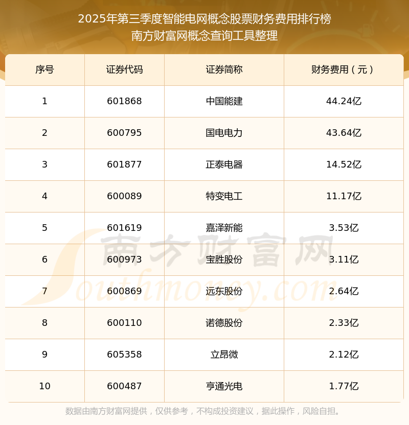 2025年第三季度,智能电网概念股票财务费用排行榜中,中国能建(601868)财务费用总额高达44.24亿,国电电力(600795)和正泰电器(601877)排名第二和第三,特变电工(600089)、嘉泽新能(601619)、宝胜股份(600973)、远东股份(600869)、诺德股份(600110)、立昂微(605358)、亨通光电(600487)进入前十,财务费用总额分别排名第4-10名。