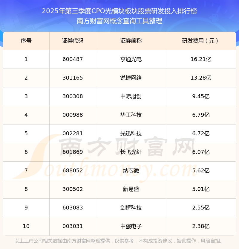 2025年第三季度CPO光模块板块股票研发投入排行榜如下:亨通光电(600487)研发投入总额高达16.21亿,锐捷网络(301165)和中际旭创(300308)分别排名第二和第三,华工科技(000988)、光迅科技(002281)、长飞光纤(601869)、纳芯微(688052)、新易盛(300502)、剑桥科技(603083)、中瓷电子(003031)分别进入前十,其研发投入总额分别排名第4-10名。