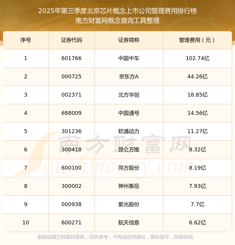 2025年第三季度,北京芯片概念上市公司管理费用排行榜中,中国中车(601766)的管理费用总额高达102.74亿,京东方A(000725)和北方华创(002371)分别位居第二和第三,中国通号(688009)、软通动力(301236)、昆仑万维(300418)、同方股份(600100)、神州泰岳(300002)、紫光股份(000938)、航天信息(600271)分别进入前十,其管理费用总额分别排名第4-10名。