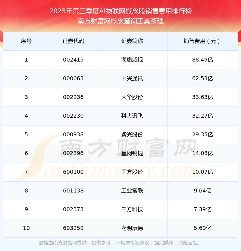 2025年第三季度,AI物联网概念股销售费用排行榜如下:海康威视(002415)的销售费用总额高达88.49亿,中兴通讯(000063)和大华股份(002236)分别位居第二和第三,科大讯飞(002230)、紫光股份(000938)、星网锐捷(002396)、同方股份(600100)、工业富联(601138)、千方科技(002373)、药明康德(603259)分别进入前十,其销售费用总额分别排名第4-10名。
