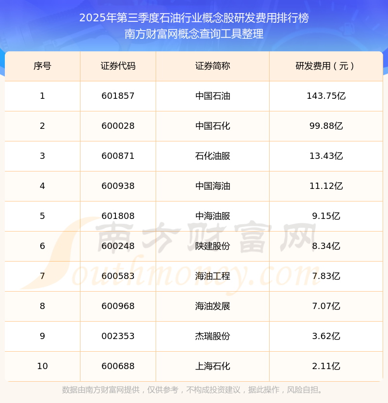 2025年第三季度石油行业概念股研发费用排行榜如下:中国石油(601857)研发费用总额高达143.75亿,中国石化(600028)和石化油服(600871)分别排名第二和第三,中国海油(600938)、中海油服(601808)、陕建股份(600248)、海油工程(600583)、海油发展(600968)、杰瑞股份(002353)、上海石化(600688)分别进入前十,其研发费用总额分别排名第4-10名。