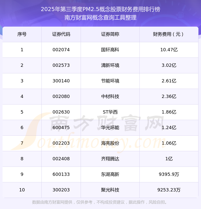 2025年第三季度,PM2.5概念股票财务费用排名如下:国轩高科(002074)的财务费用总额高达10.47亿,清新环境(002573)和节能环境(300140)分别位居第二和第三,中材科技(002080)、ST华西(002630)、华光环能(600475)、海亮股份(002203)、齐翔腾达(002408)、东湖高新(600133)、聚光科技(300203)分别进入前十,其财务费用总额分别排名第4-10名。