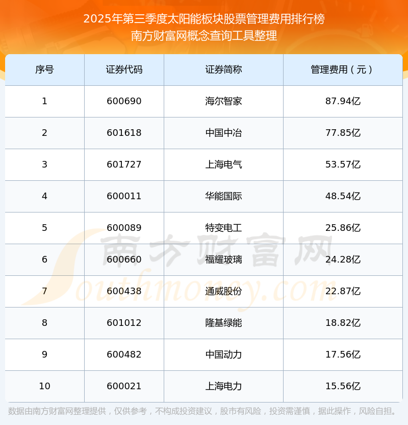 2025年第三季度,太阳能板块股票管理费用排名如下:海尔智家(600690)的管理费用总额高达87.94亿,中国中冶(601618)和上海电气(601727)位居第二和第三,华能国际(600011)、特变电工(600089)、福耀玻璃(600660)、通威股份(600438)、隆基绿能(601012)、中国动力(600482)、上海电力(600021)分别进入前十,其管理费用总额分别排名第4-10名。