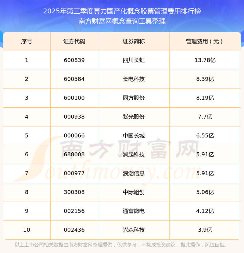 2025年第三季度,算力国产化概念股票管理费用排行榜如下:四川长虹(600839)的管理费用总额高达13.78亿,长电科技(600584)和同方股份(600100)分别排名第二和第三,紫光股份(000938)、中国长城(000066)、澜起科技(688008)、浪潮信息(000977)、中际旭创(300308)、通富微电(002156)、兴森科技(002436)分别进入前十,其管理费用总额分别排名第4-10名。