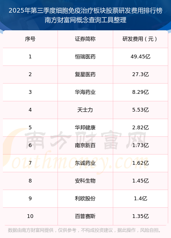 2025年第三季度,细胞免疫治疗板块股票研发费用排行榜中,恒瑞医药(600276)研发费用总额高达49.45亿,复星医药(600196)和华海药业(600521)位居第二和第三,天士力(600535)、华邦健康(002004)、南京新百(600682)、东诚药业(002675)、安科生物(300009)、利欧股份(002131)、百普赛斯(301080)进入前十,研发费用总额分别排名第4-10名。