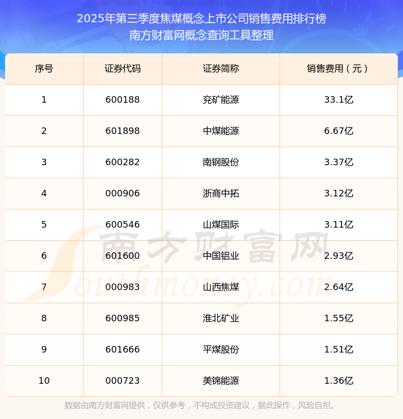 2025年第三季度焦煤概念上市公司销售费用排行榜如下:兖矿能源(600188)的销售费用总额高达33.1亿,中煤能源(601898)和南钢股份(600282)分别位居第二和第三,浙商中拓(000906)、山煤国际(600546)、中国铝业(601600)、山西焦煤(000983)、淮北矿业(600985)、平煤股份(601666)、美锦能源(000723)分别进入前十,其销售费用总额分别排名第4-10名。