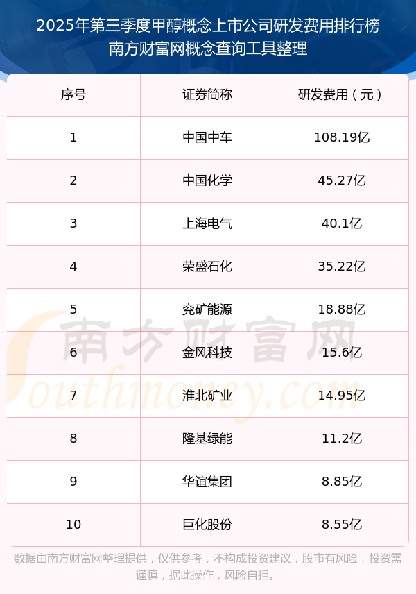 2025年第三季度甲醇概念上市公司研发费用排行榜如下:中国中车(601766)研发费用总额高达108.19亿,中国化学(601117)和上海电气(601727)分别位居第二和第三,荣盛石化(002493)、兖矿能源(600188)、金风科技(002202)、淮北矿业(600985)、隆基绿能(601012)、华谊集团(600623)、巨化股份(600160)分别进入前十,其研发费用总额分别排名第4-10名。