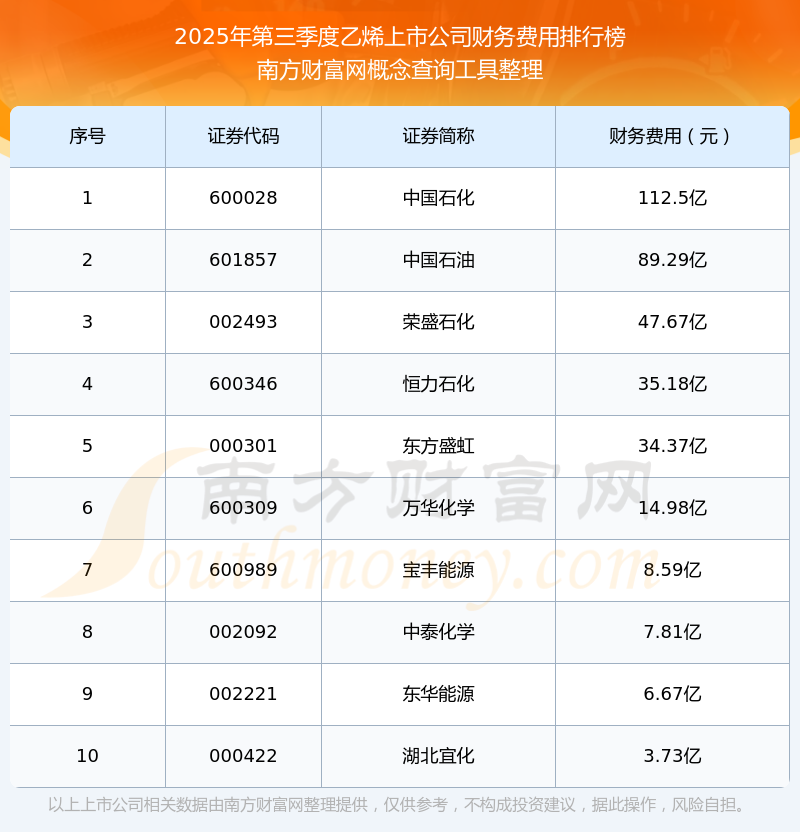 2025年第三季度,乙烯上市公司财务费用排名如下:中国石化(600028)的财务费用总额高达112.5亿,中国石油(601857)和荣盛石化(002493)分别位居第二和第三,恒力石化(600346)、东方盛虹(000301)、万华化学(600309)、宝丰能源(600989)、中泰化学(002092)、东华能源(002221)、湖北宜化(000422)分别进入前十,其财务费用总额分别排名第4-10名。