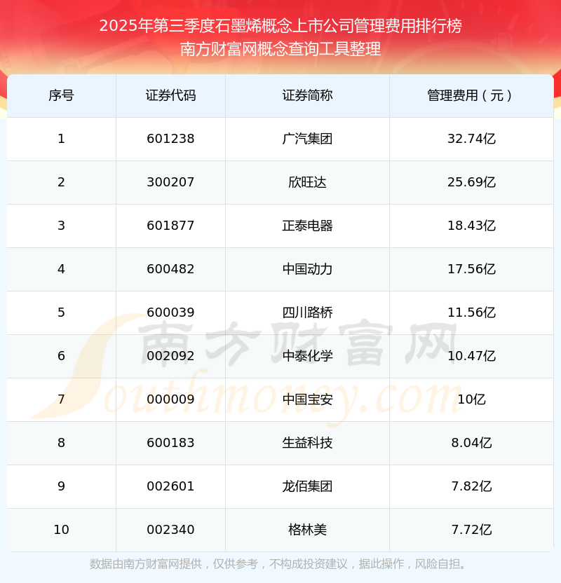 2025年第三季度,石墨烯概念上市公司管理费用排名如下:广汽集团(601238)的管理费用总额高达32.74亿,欣旺达(300207)和正泰电器(601877)位居第二和第三,中国动力(600482)、四川路桥(600039)、中泰化学(002092)、中国宝安(000009)、生益科技(600183)、龙佰集团(002601)、格林美(002340)分别进入前十,其管理费用总额分别排名第4-10名。