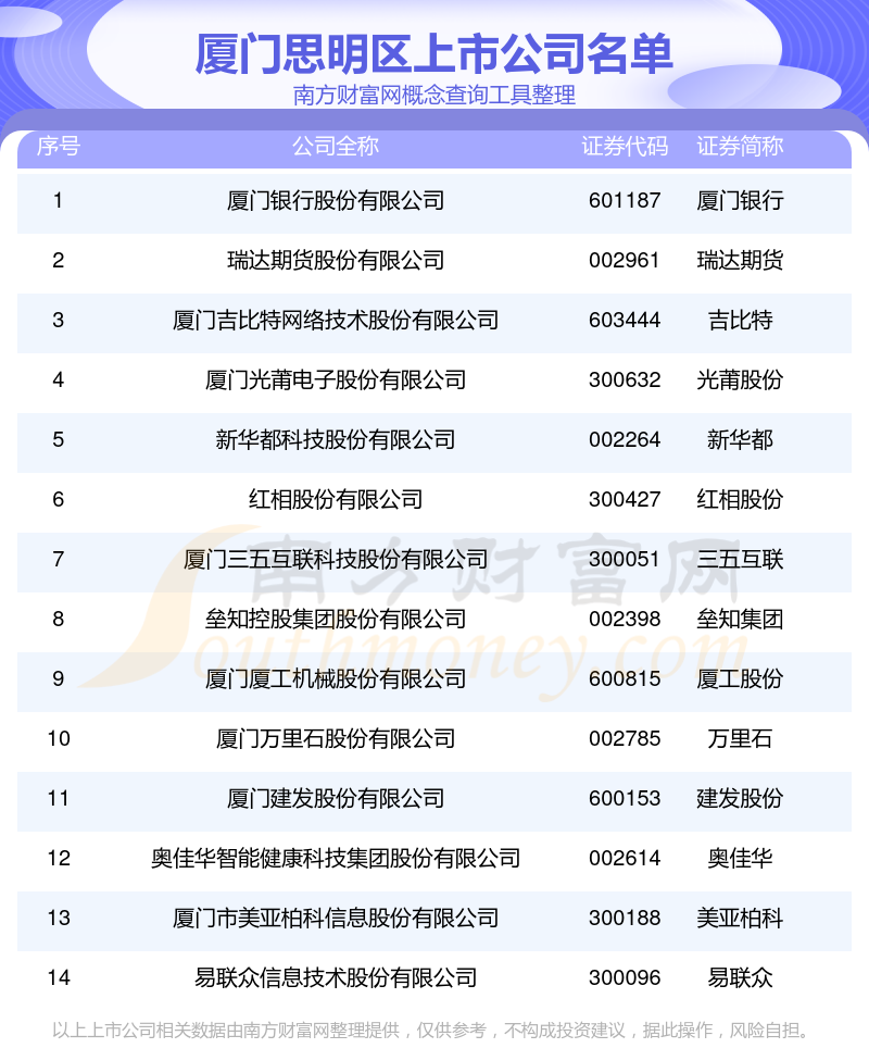 数量上来看,截至10月15日,厦门思明区共有14家A股上市公司。其中,上交所4家(建发股份、厦工股份、厦门银行、吉比特等),深交所10家(新华都、垒知集团、奥佳华、万里石、瑞达期货、琏升科技、易联众、国投智能、红相股份、光莆股份等)。