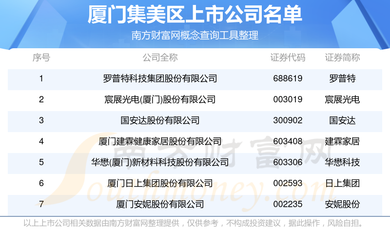 从数量来看,截至10月15日,厦门集美区共有7家A股上市公司。其中,上交所3家(华懋科技、建霖家居、罗普特等),深交所4家(安妮股份、日上集团、宸展光电、国安达等)。