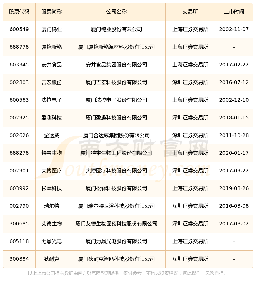 截至10月18日,厦门海沧区共有14家上市公司,南方财富网趋势选股系统为您整理了厦门海沧区在A股上市的公司。