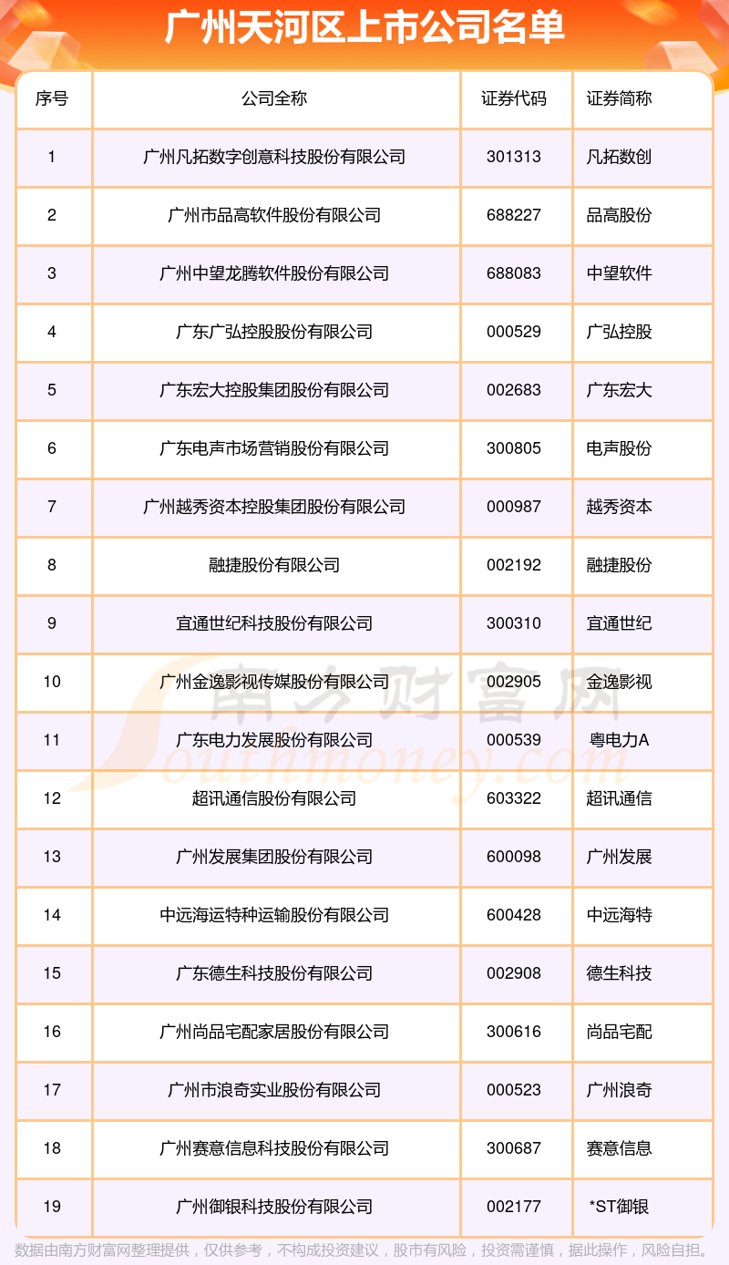 数量上来看,截至10月18日,广州天河区共有19家A股上市公司。其中,在上海证券交易所上市的有中远海特、广州发展、超讯通信、中望软件、品高股份等5家,在深圳证券交易所上市的有14家:御银股份、赛意信息、红棉股份、尚品宅配、德生科技、粤电力A、金逸影视、宜通世纪、融捷股份、越秀资本等。