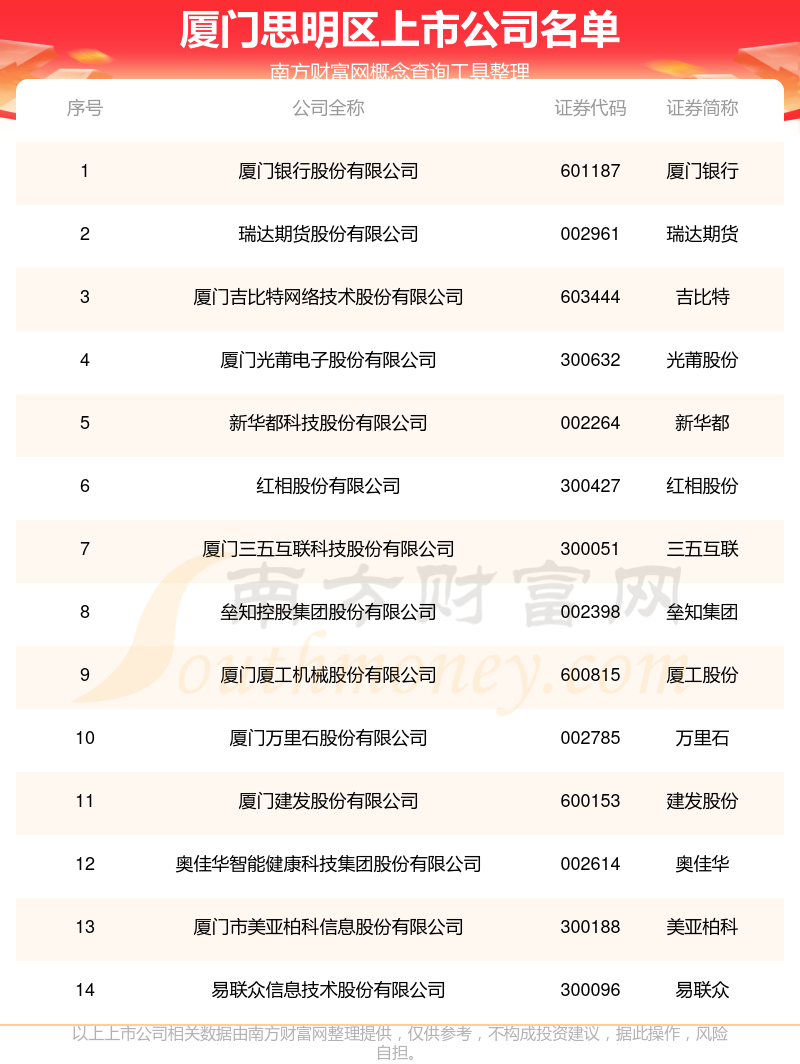 从数量来看,截至10月18日,厦门思明区共有14家A股上市公司。其中,上交所4家(建发股份、厦工股份、厦门银行、吉比特等),深交所10家(新华都、垒知集团、奥佳华、万里石、瑞达期货、琏升科技、易联众、国投智能、红相股份、光莆股份等)。