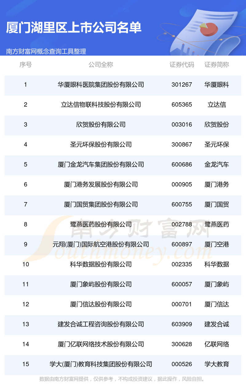 数量上,截至10月18日,厦门湖里区共有15家A股上市公司。具体分布为,上交所:厦门象屿、金龙汽车、厦门国贸、厦门空港、建发合诚、立达信等6家,深交所:学大教育、厦门信达、厦门港务、科华数据、鹭燕医药、欣贺股份、亿联网络、圣元环保、华厦眼科等9家。