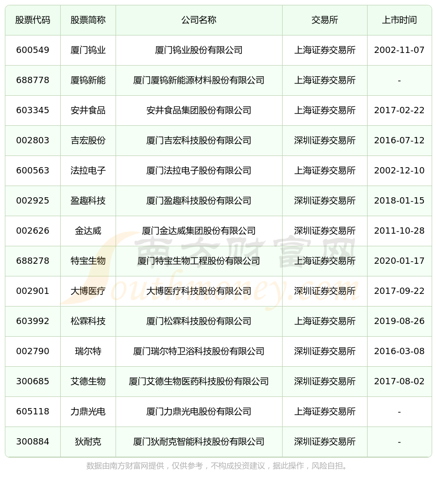 截至10月18日,厦门海沧区共有14家上市公司,南方财富网趋势选股系统为您整理了厦门海沧区在A股上市的公司。