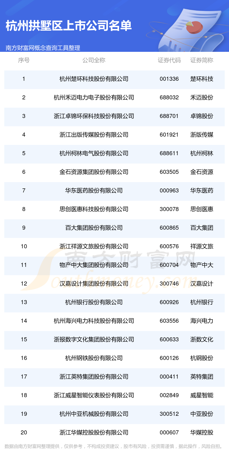 杭州拱墅区的上市公司都有哪些?南方财富网趋势选股系统为您整理了归属于杭州拱墅区,并且在A股上市的公司。