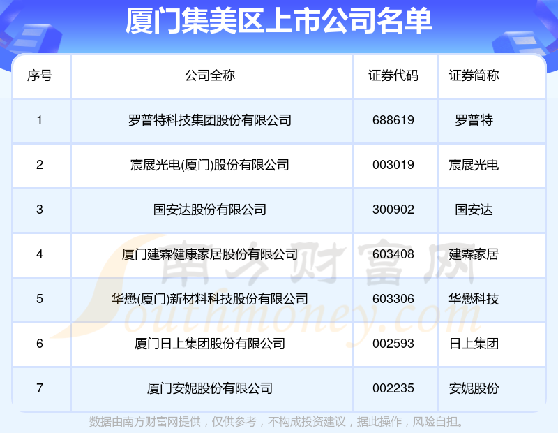数量上,截至10月18日,厦门集美区共有7家A股上市公司。具体分布为上海证券交易所:华懋科技、建霖家居、罗普特等3家,深圳证券交易所:安妮股份、日上集团、宸展光电、国安达等4家。