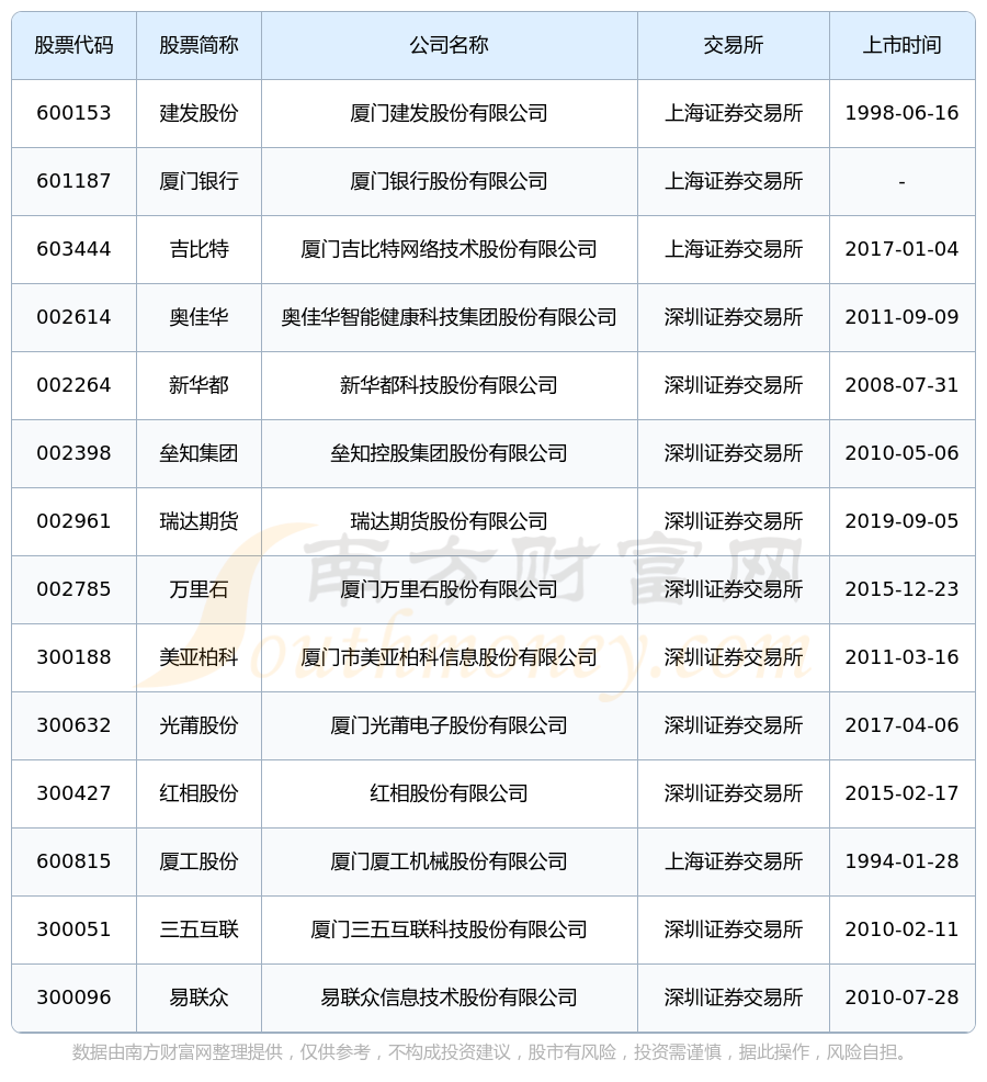 截至10月18日,厦门思明区共有14家上市公司,南方财富网趋势选股系统为您整理了厦门思明区在A股上市的公司。