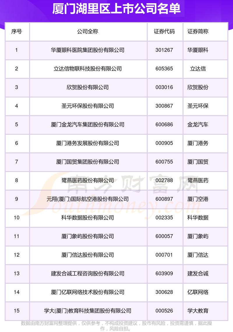 从数量来看,截至10月18日,厦门湖里区共有15家A股上市公司。其中,在上海证券交易所上市的有厦门象屿、金龙汽车、厦门国贸、厦门空港、建发合诚、立达信等6家,在深圳证券交易所上市的有9家:学大教育、厦门信达、厦门港务、科华数据、鹭燕医药、欣贺股份、亿联网络、圣元环保、华厦眼科等。