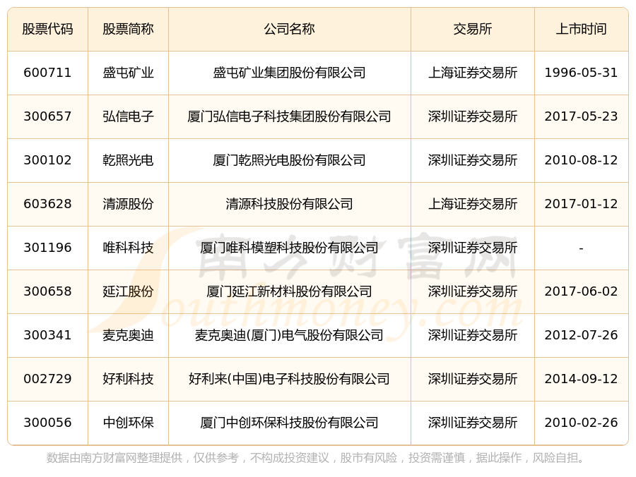 截至10月18日,厦门翔安区共有9家上市公司,南方财富网趋势选股系统为您整理了厦门翔安区在A股上市的公司。