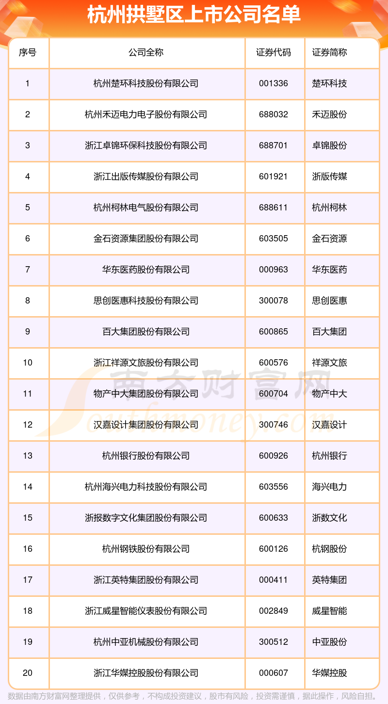 杭州拱墅区的上市公司都有哪些?南方财富网趋势选股系统为您整理了归属于杭州拱墅区,并且在A股上市的公司。