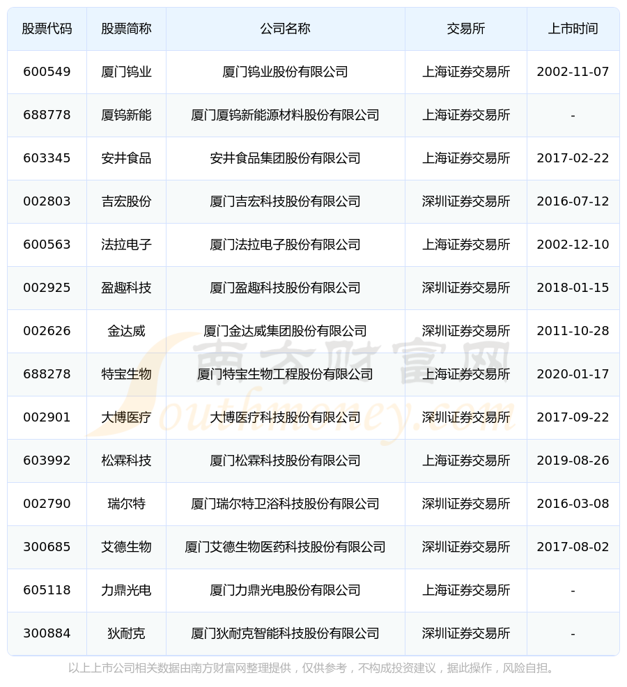 截至10月20日,厦门海沧区共有14家上市公司,南方财富网趋势选股系统为您整理了厦门海沧区在A股上市的公司。