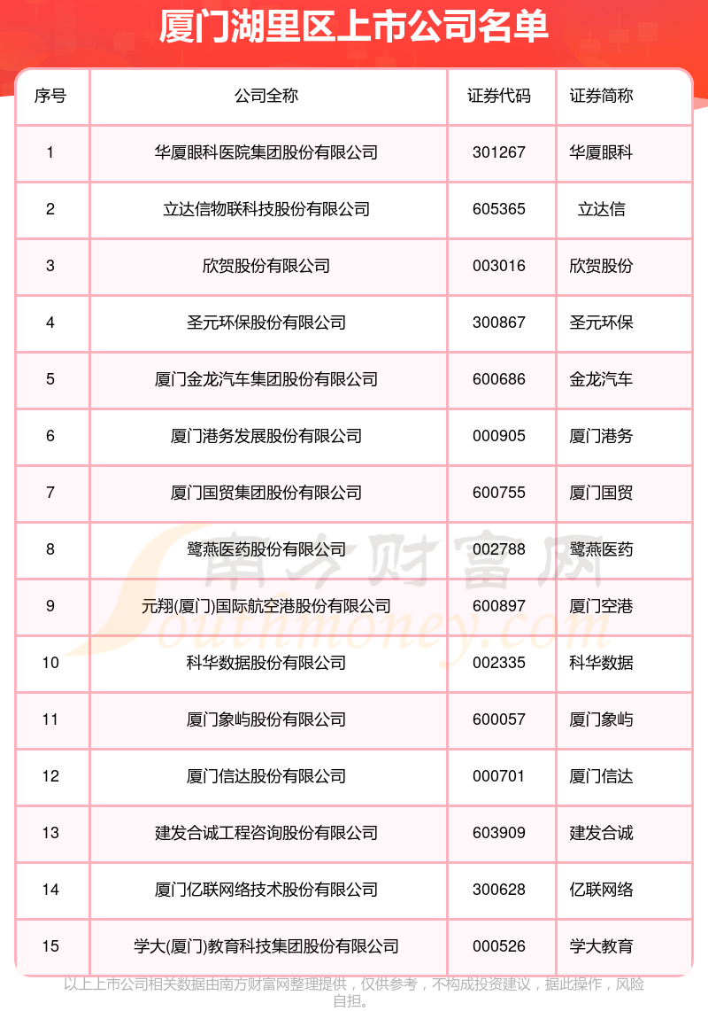 数量上来看,截至10月20日,厦门湖里区共有15家A股上市公司。其中,在上海证券交易所上市的有厦门象屿、金龙汽车、厦门国贸、厦门空港、建发合诚、立达信等6家,在深圳证券交易所上市的有9家:学大教育、厦门信达、厦门港务、科华数据、鹭燕医药、欣贺股份、亿联网络、圣元环保、华厦眼科等。