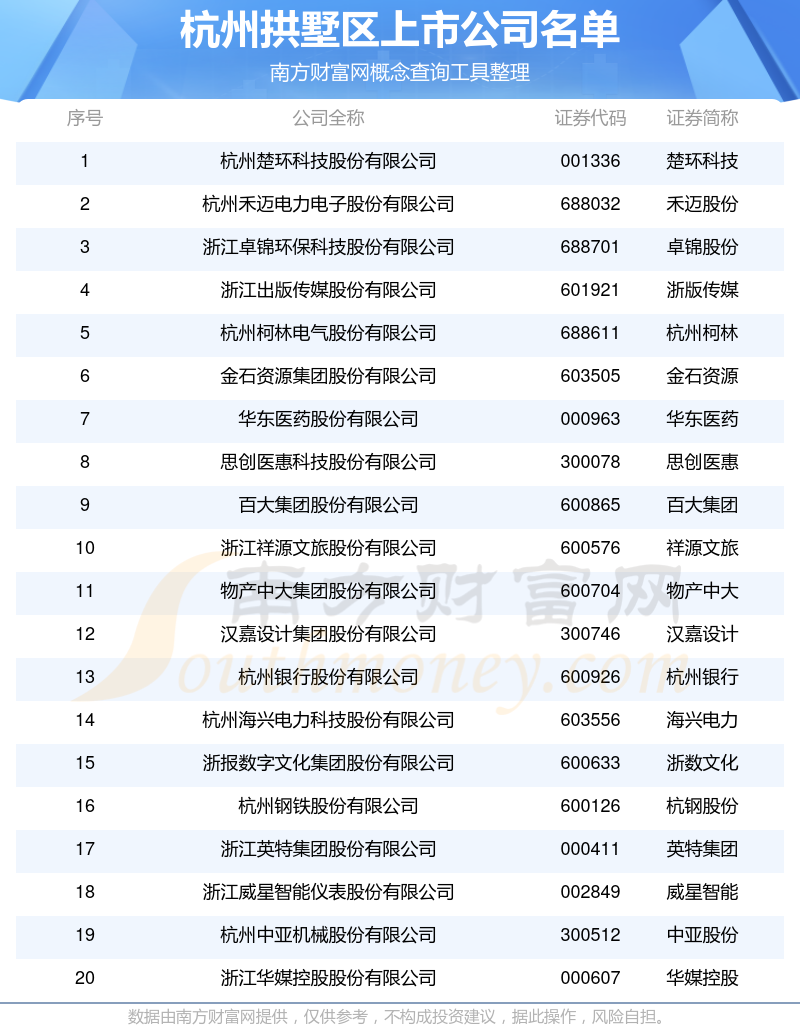 杭州拱墅区的上市公司都有哪些?南方财富网趋势选股系统为您整理了归属于杭州拱墅区,并且在A股上市的公司。