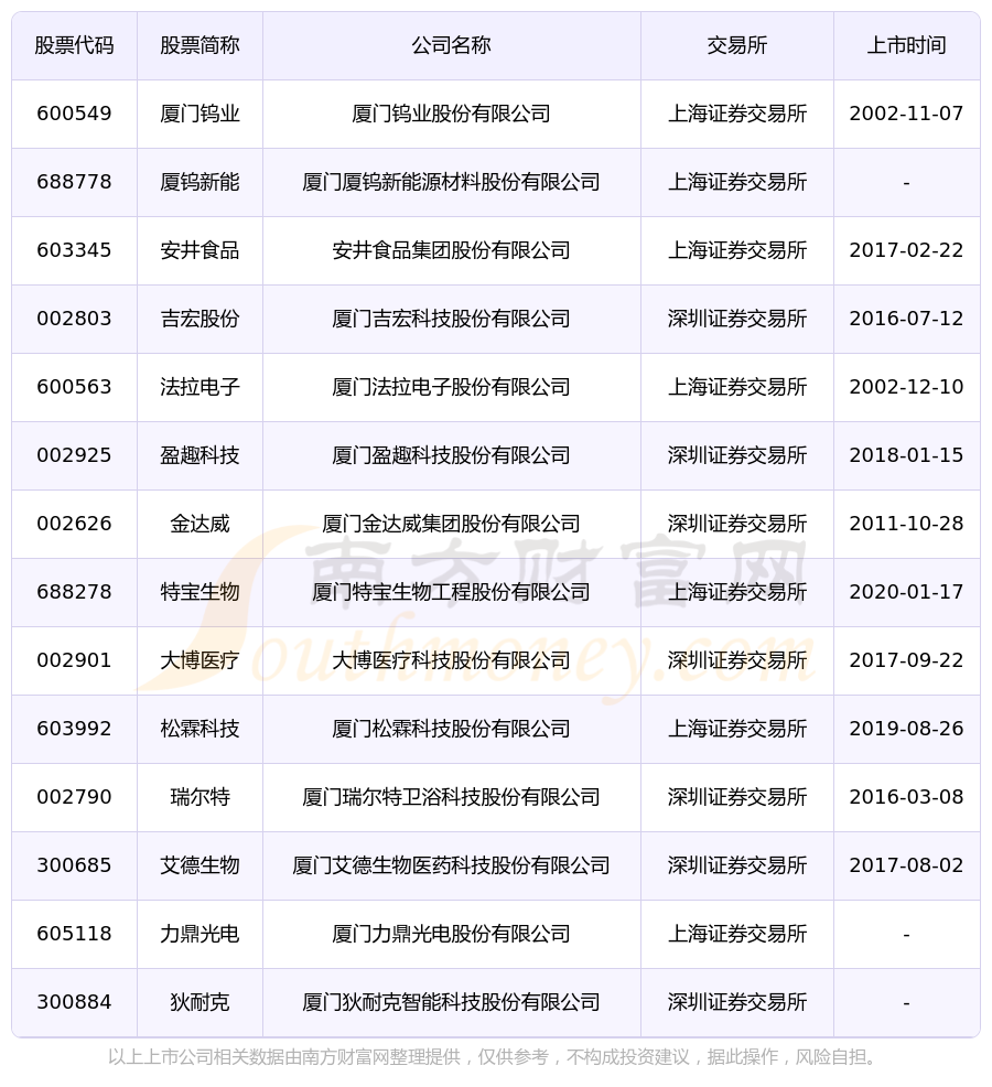 截至10月21日,厦门海沧区共有14家上市公司,南方财富网趋势选股系统为您整理了厦门海沧区在A股上市的公司。