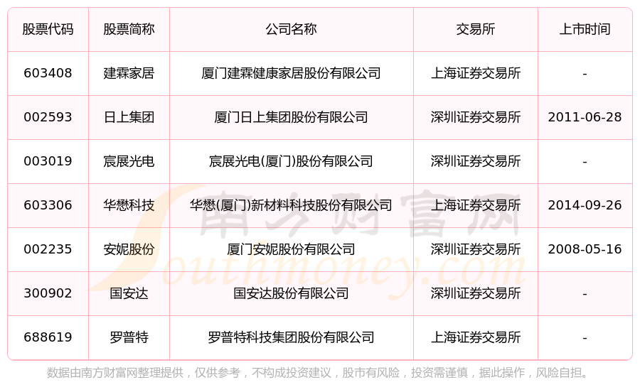 截至10月22日,厦门集美区共有7家上市公司,南方财富网趋势选股系统为您整理了厦门集美区在A股上市的公司。