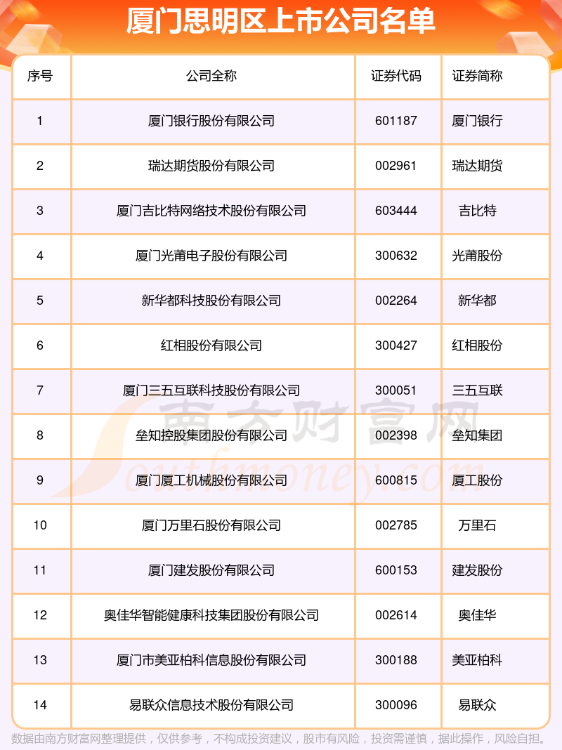 数量上,截至10月22日,厦门思明区共有14家A股上市公司。具体分布为上海证券交易所:建发股份、厦工股份、厦门银行、吉比特等4家,深圳证券交易所:新华都、垒知集团、奥佳华、万里石、瑞达期货、琏升科技、易联众、国投智能、红相股份、光莆股份等10家。