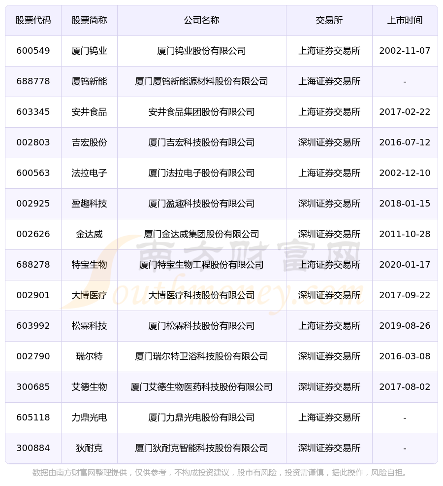 截至10月22日,厦门海沧区共有14家上市公司,南方财富网趋势选股系统为您整理了厦门海沧区在A股上市的公司。