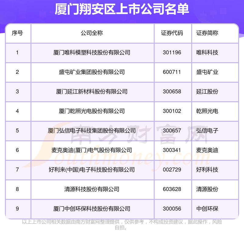 从数量来看,截至10月22日,厦门翔安区共有9家A股上市公司。其中,上交所2家(盛屯矿业、清源股份等),深交所7家(好利科技、中创环保、乾照光电、麦克奥迪、弘信电子、延江股份、唯科科技等)。