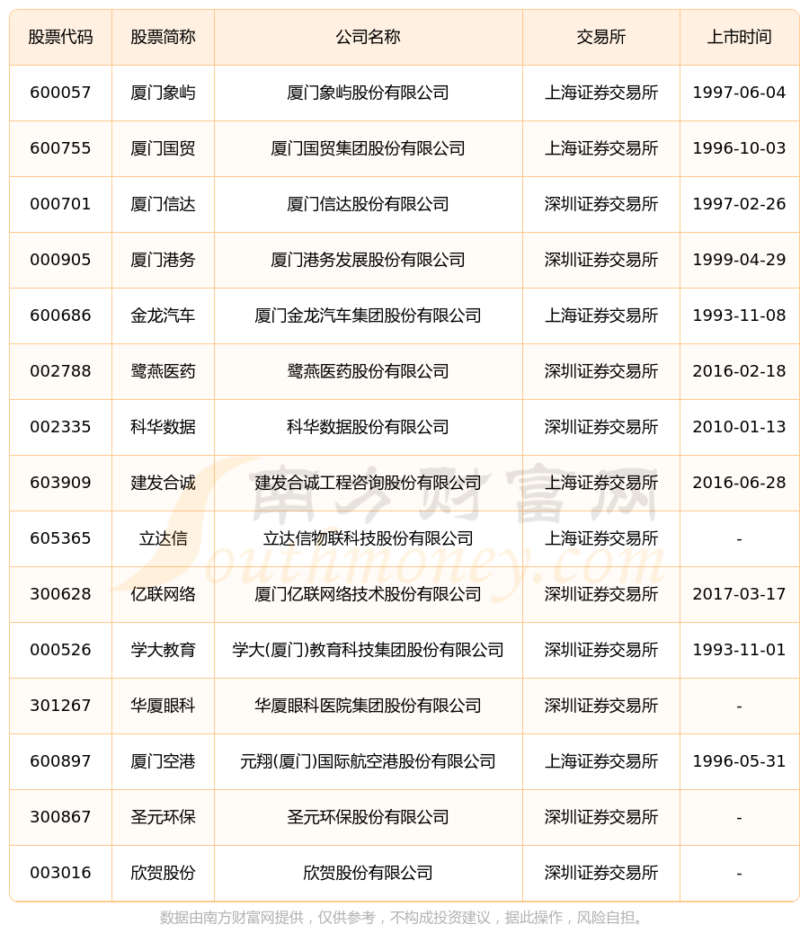截至10月22日,厦门湖里区共有15家上市公司,南方财富网趋势选股系统为您整理了厦门湖里区在A股上市的公司。