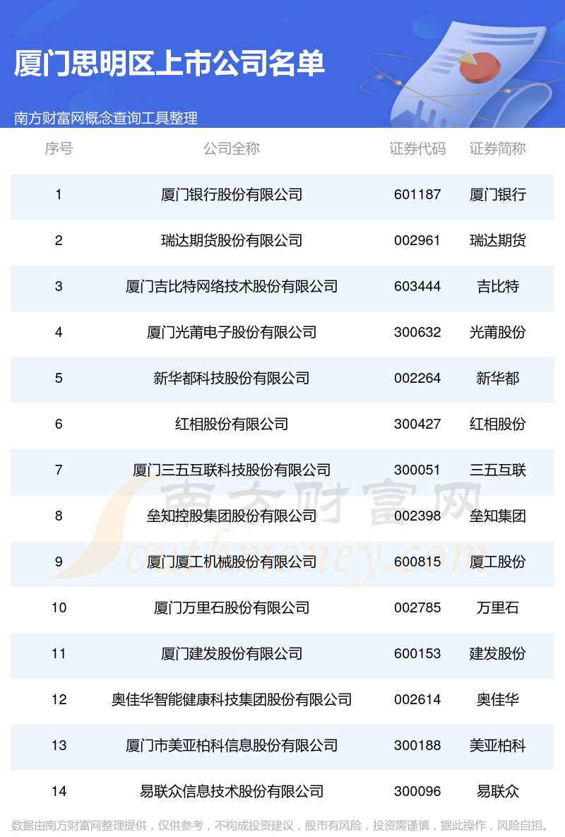 数量上,截至10月22日,厦门思明区共有14家A股上市公司。其中,在上海证券交易所上市的有建发股份、厦工股份、厦门银行、吉比特等4家,在深圳证券交易所上市的有10家:新华都、垒知集团、奥佳华、万里石、瑞达期货、琏升科技、易联众、国投智能、红相股份、光莆股份等。