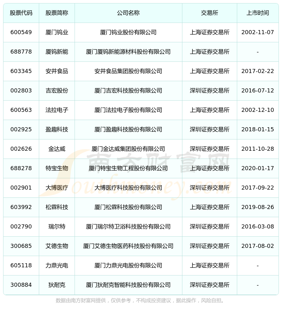 截至10月22日,厦门海沧区共有14家上市公司,南方财富网趋势选股系统为您整理了厦门海沧区在A股上市的公司。
