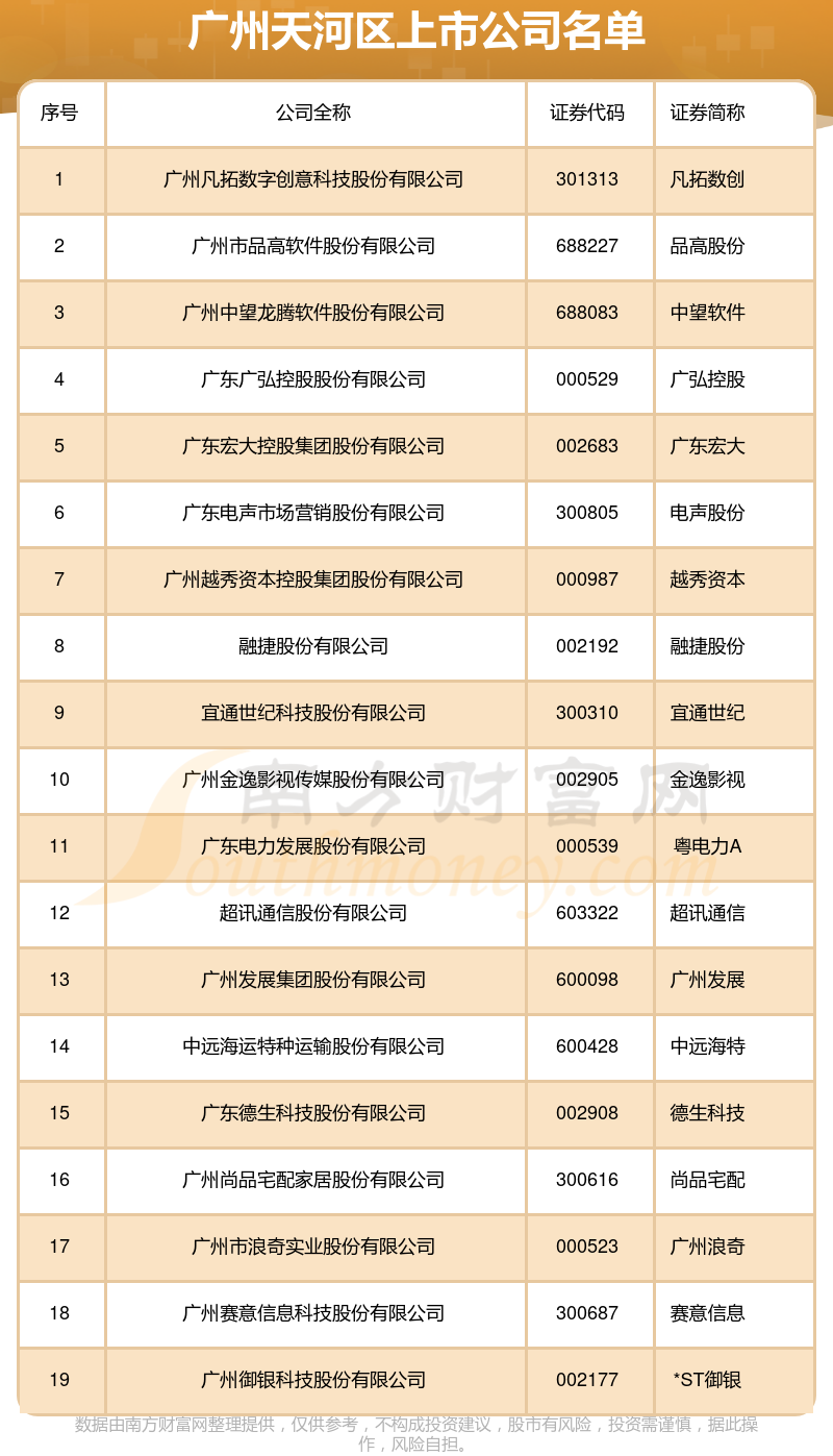 数量上来看,截至10月22日,广州天河区共有19家A股上市公司。其中,上交所5家(中远海特、广州发展、超讯通信、中望软件、品高股份等),深交所14家(御银股份、赛意信息、红棉股份、尚品宅配、德生科技、粤电力A、金逸影视、宜通世纪、融捷股份、越秀资本等)。