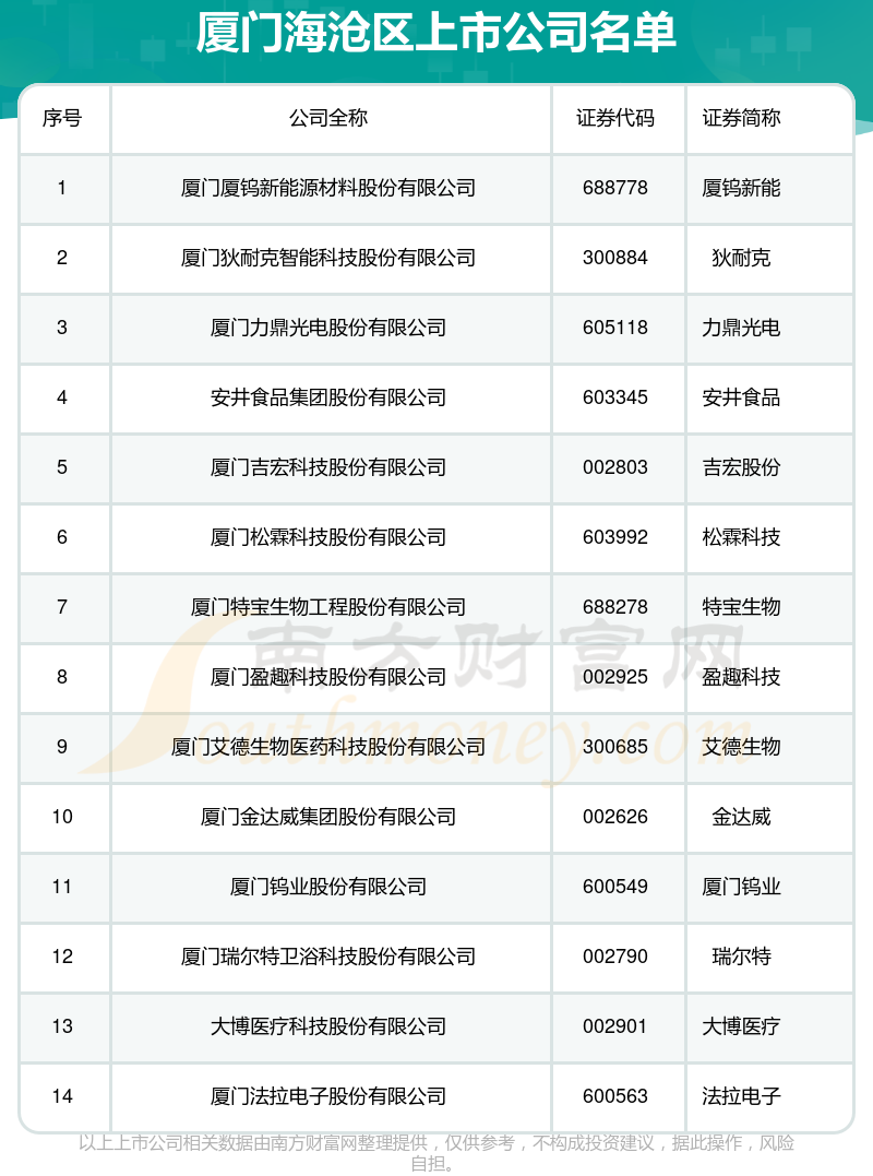 从数量方面来看,截至10月22日,厦门海沧区共有14家A股上市公司。具体分布为上海证券交易所:厦门钨业、法拉电子、安井食品、松霖科技、力鼎光电、特宝生物、厦钨新能等7家,深圳证券交易所:金达威、瑞尔特、吉宏股份、大博医疗、盈趣科技、艾德生物、狄耐克等7家。