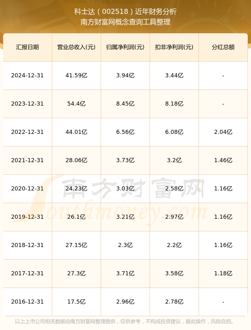 公司2024年实现营业收入41.59亿元,同比增长-23.54%;净利润3.94亿元,同比增长-53.38%;毛利率29.43%。