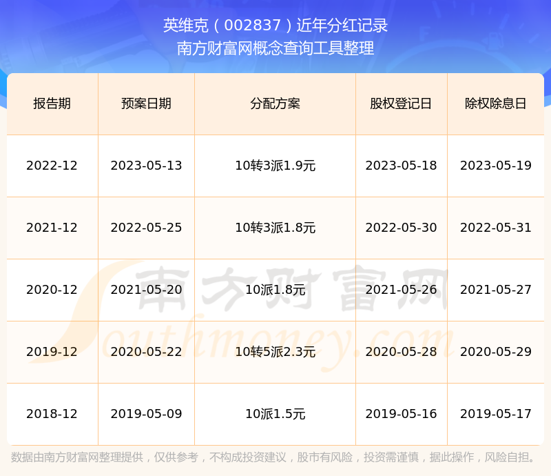英维克最新一次公布的分红方案为10转3派1.9元。本次权益分派股权登记日为2023年5月18日,除权除息日为2023年5月19日,派息日为2023年5月19日。