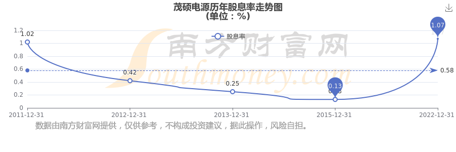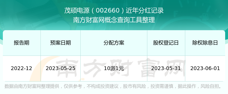 茂硕电源最新一次公布的分红方案为10派1元。本次权益分派股权登记日为2023年5月31日,除权除息日为2023年6月1日,派息日为2023年6月1日。
