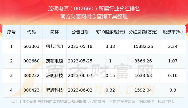 按照南方财富网趋势选股系统统计,茂硕电源所属行业为消费电子行业,消费电子行业分红排名情况如下表: