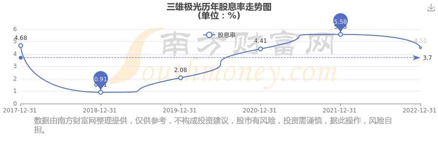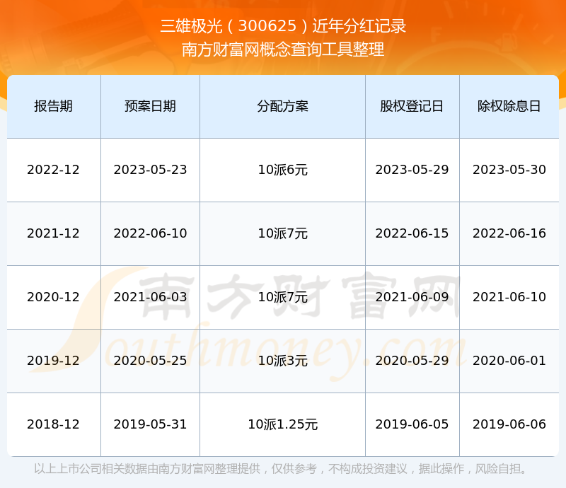 三雄极光最新一次公布的分红方案为10派6元。本次权益分派股权登记日为2023年5月29日,除权除息日为2023年5月30日,派息日为2023年5月30日。
