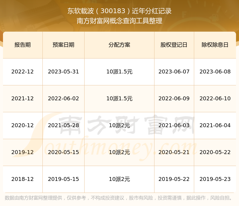 东软载波最新一次公布的分红方案为10派1.5元。本次权益分派股权登记日为2023年6月7日,除权除息日为2023年6月8日,派息日为2023年6月8日。