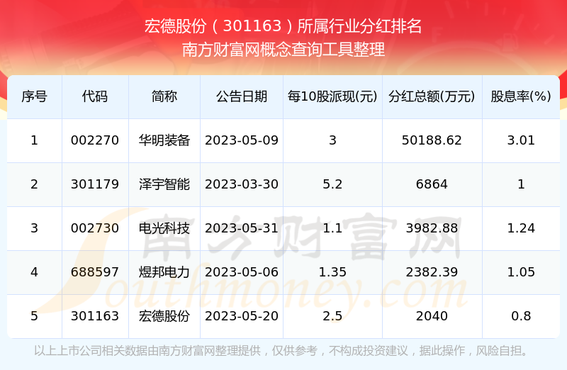 按照南方财富网趋势选股系统统计,宏德股份所属行业为风电设备行业,风电设备行业分红排名情况如下表: