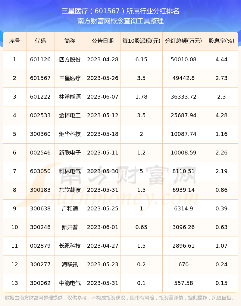 按照南方财富网趋势选股系统统计,三星医疗所属行业为智能电网行业,智能电网行业分红排名情况如下表:
