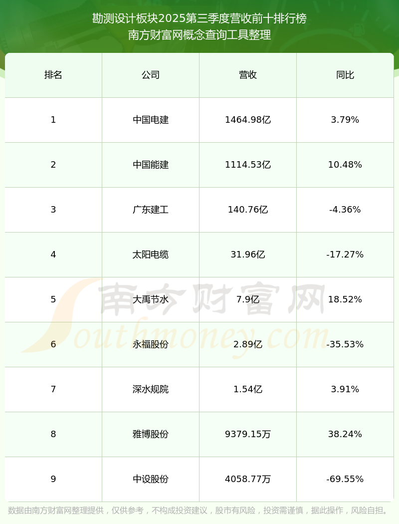 按照南方财富网概念查询工具统计,该股所属板块为勘测设计板块,该板块共有9只股票,中国能建2025第三季度营收在该板块中排名为第2名,该板块2025第三季度营收排名前十的股票如下表:
