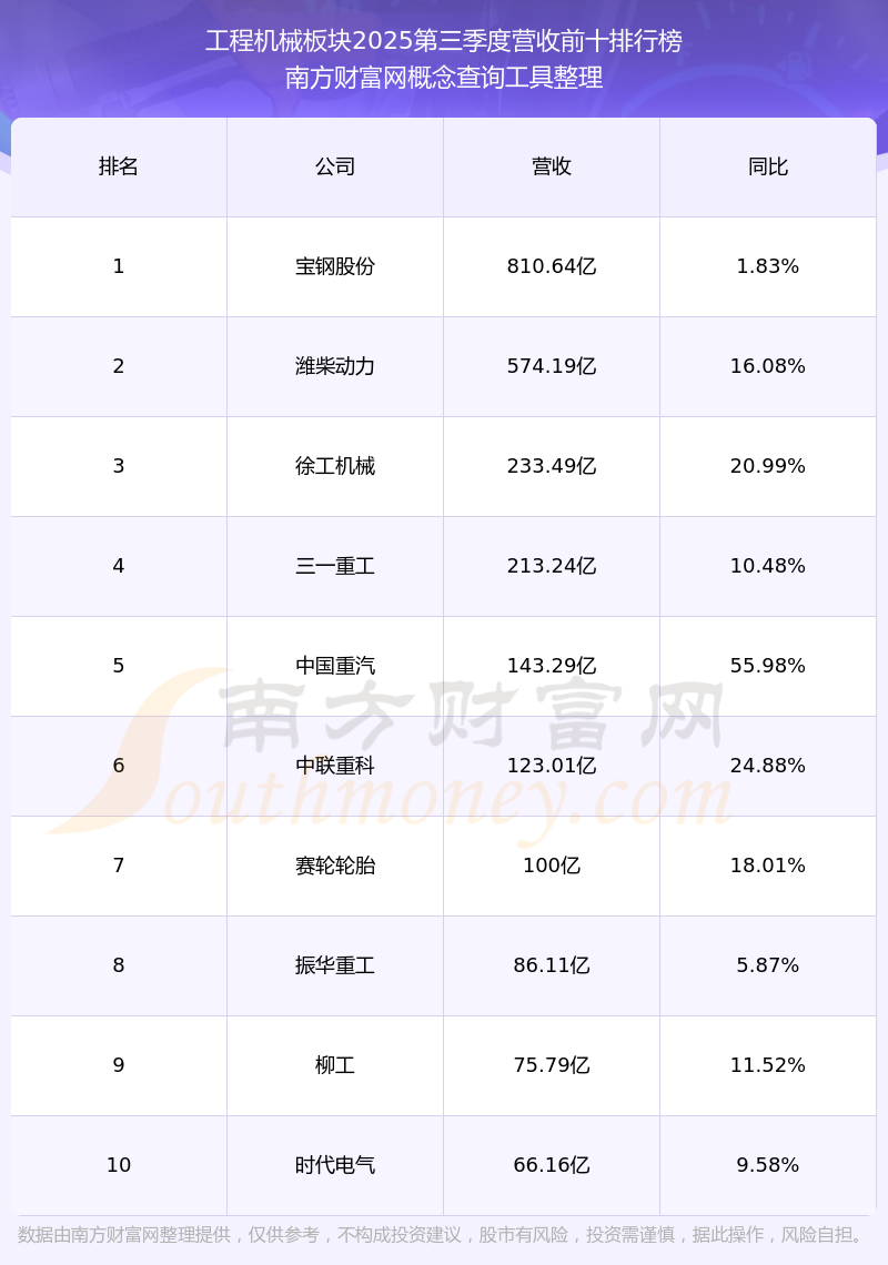 按照南方财富网概念查询工具统计,该股所属板块为工程机械板块,该板块共有92只股票,建设机械2025第三季度营收在该板块中排名为第45名,该板块2025第三季度营收排名前十的股票如下表: